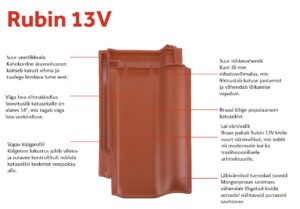 Rubin 13V angoob pruun on klassikalise välimusega keraamiline katusekivi, mis annab majale sooja ja ajatu ilme ning tagab vastupidava katuse. Rubin 13V savikivi on üks populaarsemaid savikatusekive Baltikumis. See ühendab klassikalise savikatuse välimuse ja kaasaegse nihkega katusekivi tehnoloogia. Tulemuseks on elegantne ja ajatu katus, mis sobib nii uutele majadele kui ka renoveerimisprojektidele. Rubin 13V annab hoonele luksusliku, kuid samas tasakaaluka ilme ning on oma kvaliteedi juures väga mõistliku hinnaga.
