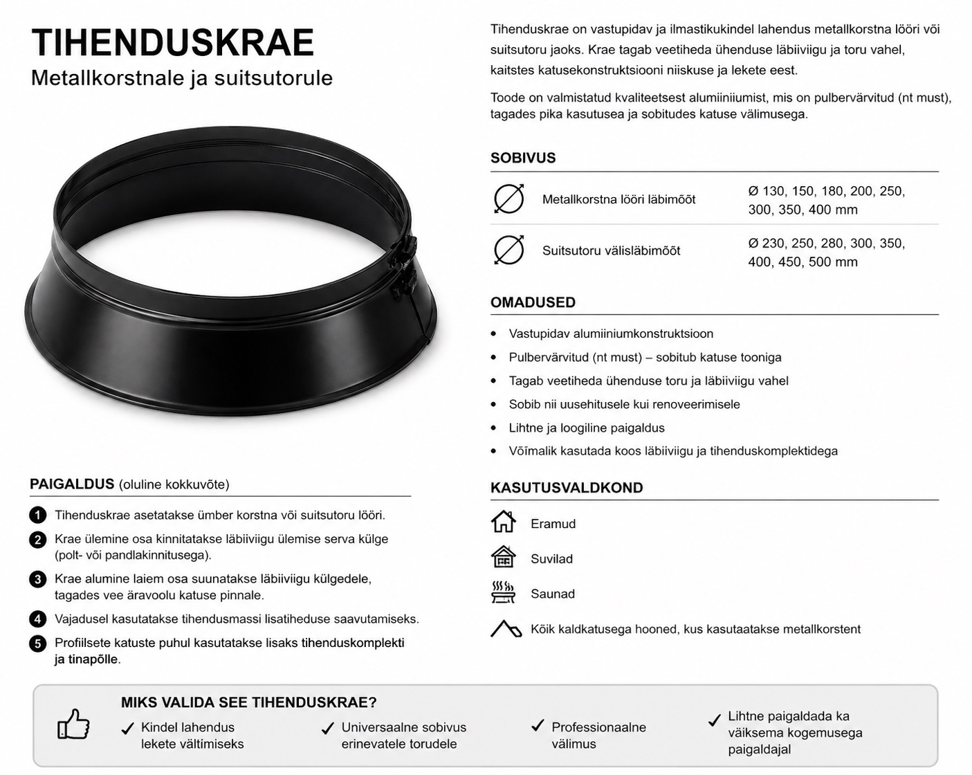 Tihenduskrae on vastupidav ja ilmastikukindel lahendus metallkorstna või suitsutoru veetihedaks ühendamiseks katuse läbiviiguga. See tagab usaldusväärse kaitse vihma, lume ja niiskuse eest, pikendades nii katuse kui ka korstnasüsteemi eluiga.