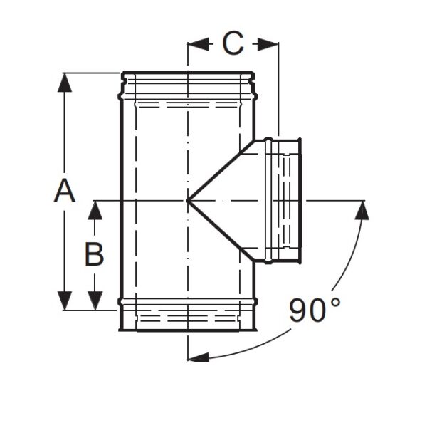 T-liiteelement 90° ICS pikk kasutatakse ühendamiseks horisontaalsest suitsutorust vertikaalse korstnasüsteemiga 90° nurga all. Haruosa saab kasutada ka tõmbestabilisaatori ühendamiseks.